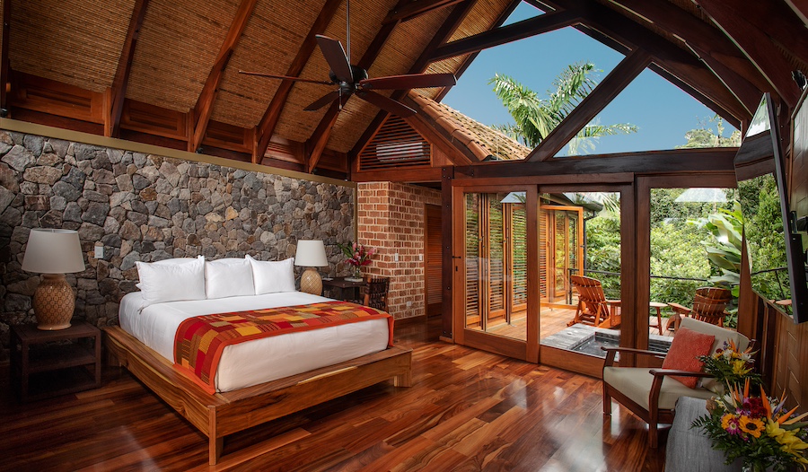 Each 872 sq. foot cabin is set on the edge of a rainforest canyon with views of Arenal Volcano. Crafted from tropical hardwoods, each cabin features a full deck with volcano view, warm spring plunge pool, double head rain shower with rainforest views, double sinks and vanity mirror, separate toilet, king bed with fine linens and four large pillows.
