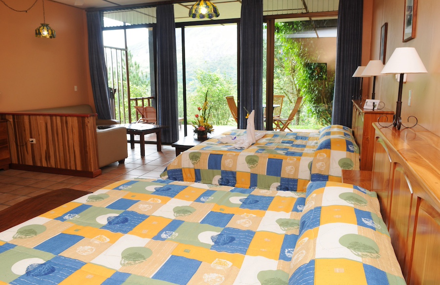 The Standard Rooms at Arenal Observatory Lodge each have balconies with Arenal Volcano or Arenal Lake views, two queen-size beds,and a private bathroom.