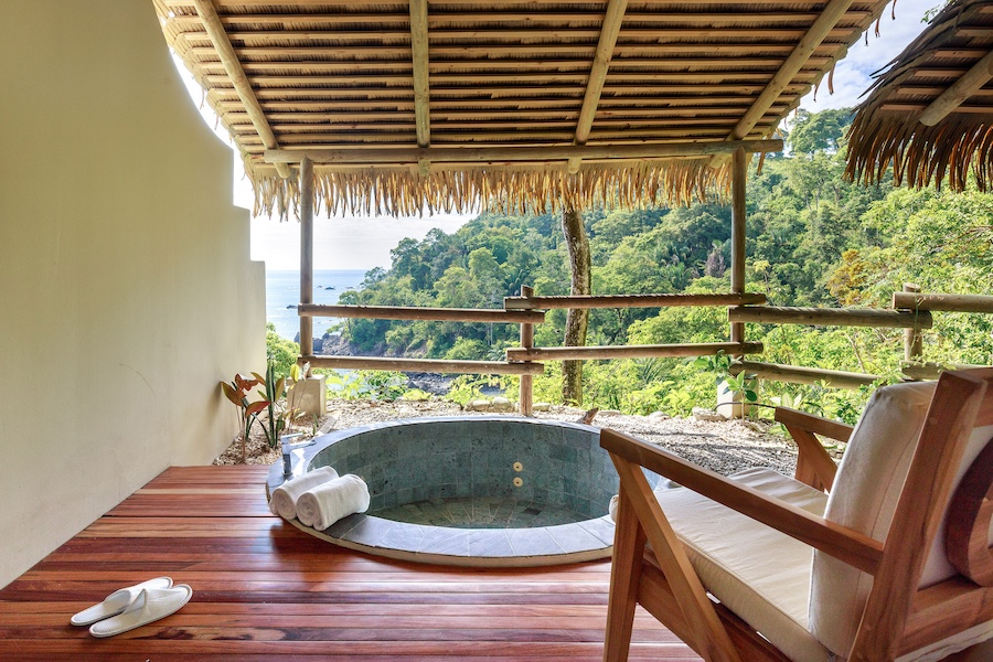 The one-bedroom 1055 square-foot Ocean View Premium Suites at Arenas Del Mar are the best in eco-luxury in the area. This suite offers the best views of Manuel Antonio National Park and plenty of space. They are located on the 2nd or third floor with amazing ocean views and an expansive terrace. It has a private tiled Jacuzzi day bed on the porch with a daybed, a bedroom with a king-size bed, a sitting area with a trundle bed, a kitchenette, and two bathrooms. These suites accommodate 3 adults or 2 adults and 2 children.