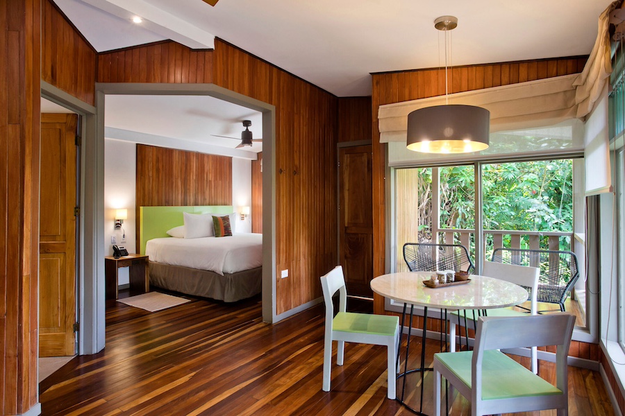 Junior Suites can accommodate two adults and one or two children. They have a separate bedroom from the living area. The bedding includes one king bed and one twin day bed in the living room. Junior Suites have a full bathroom, a small shared terrace, and a living room with a table, chairs, and sofa.